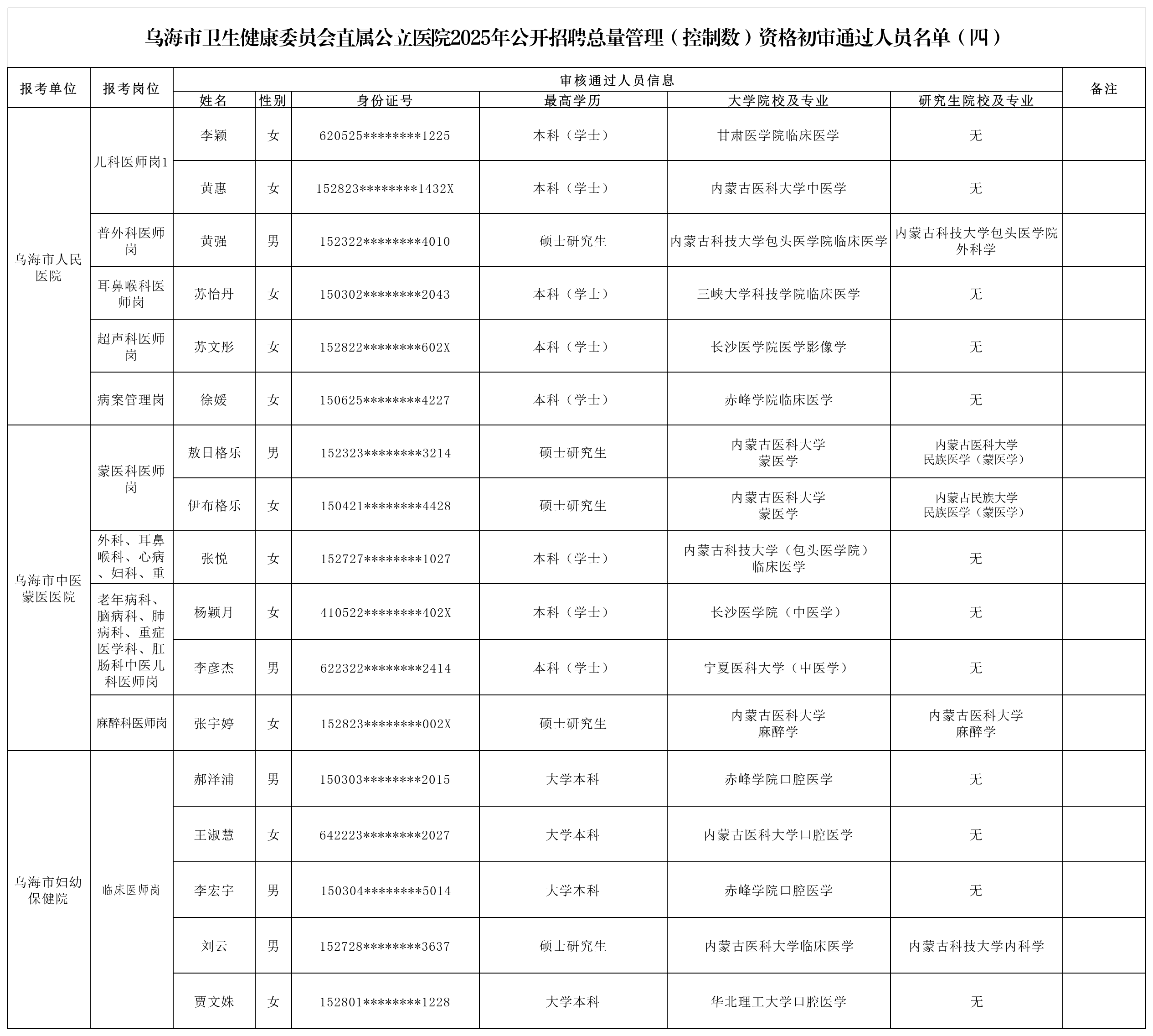 根据《乌海市卫生健康委员会直属公立医院2025年总量管理(控制数)人员招聘公告(四)》要求,经各医院组织对人员信息进行初审,目前初审工作已经结束,为确保本次招聘工作公平、公正、公开,现将乌海市卫生健康委员会直属公立医院2025年总量管理(控制数)人员招聘(四)初审通过人员名单予以公示(名单附后)。