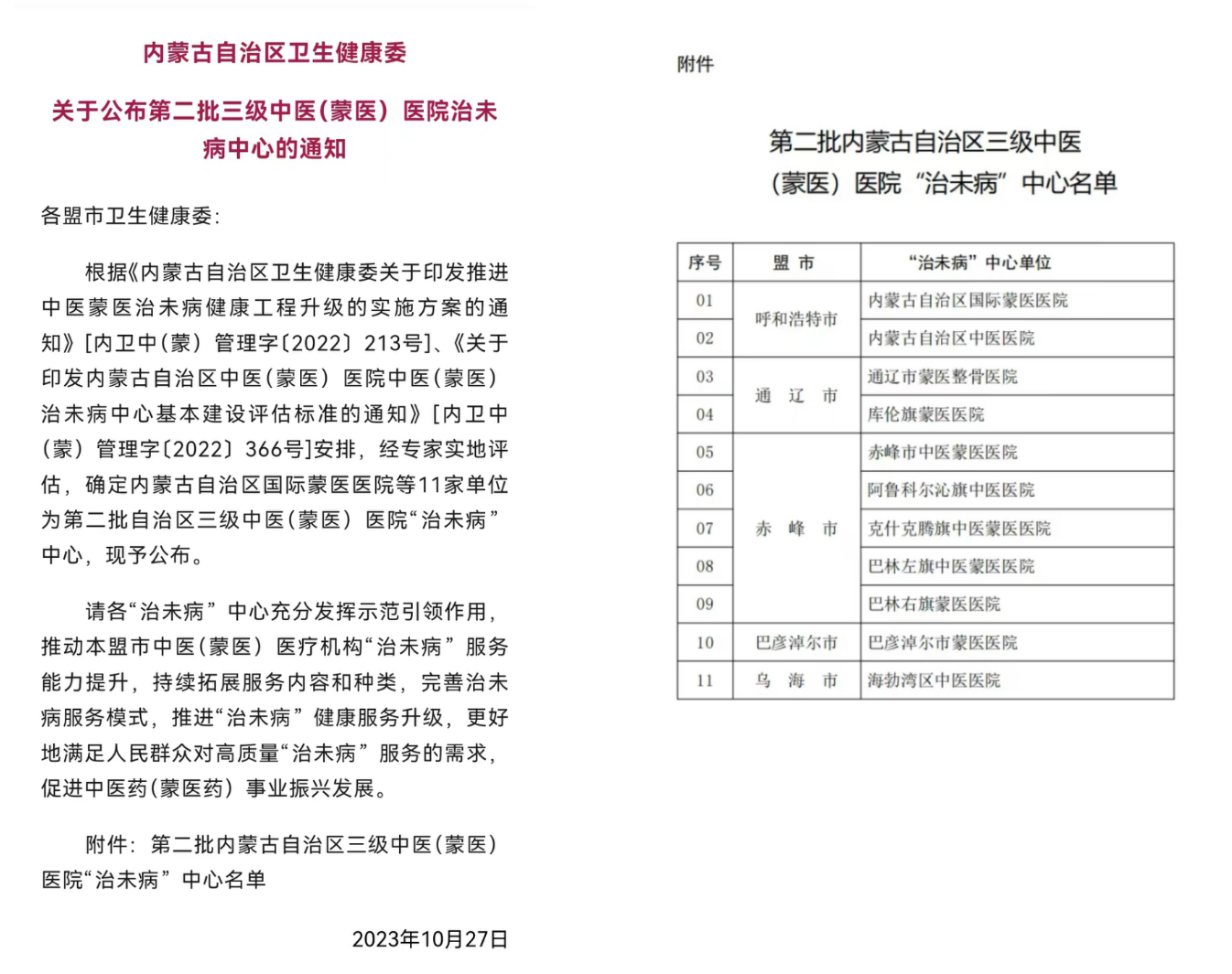 近年来,在市委、政府的大力支持下,我市中医(蒙医)医院“治未病”中心充分发挥中医药(蒙医药)特色,全面加强内涵建设,努力提升专科水平,完善治未病服务网络,为我市治未病服务能力、中医(蒙医)人才培养等做出积极贡献。