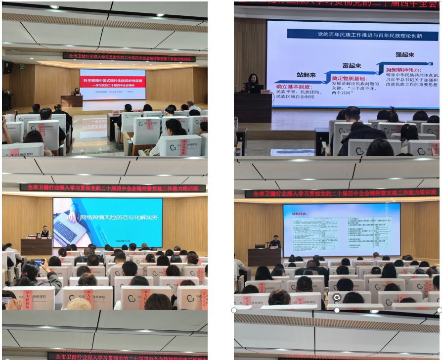 本次培训为期一天半,邀请市委党校老师、市委网信办业务骨干等开展授课,紧扣卫健行业工作实际,精心设置了党的二十届四中全会关于健康中国建设的部署要求、铸牢中华民族共同体意识、基层党建工作实务、网络舆情风险防范与化解实务等课程。