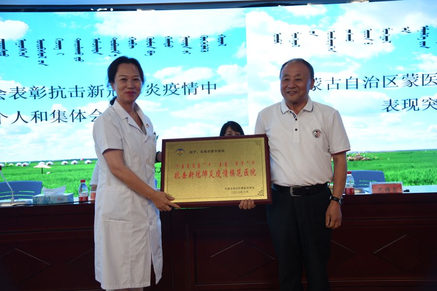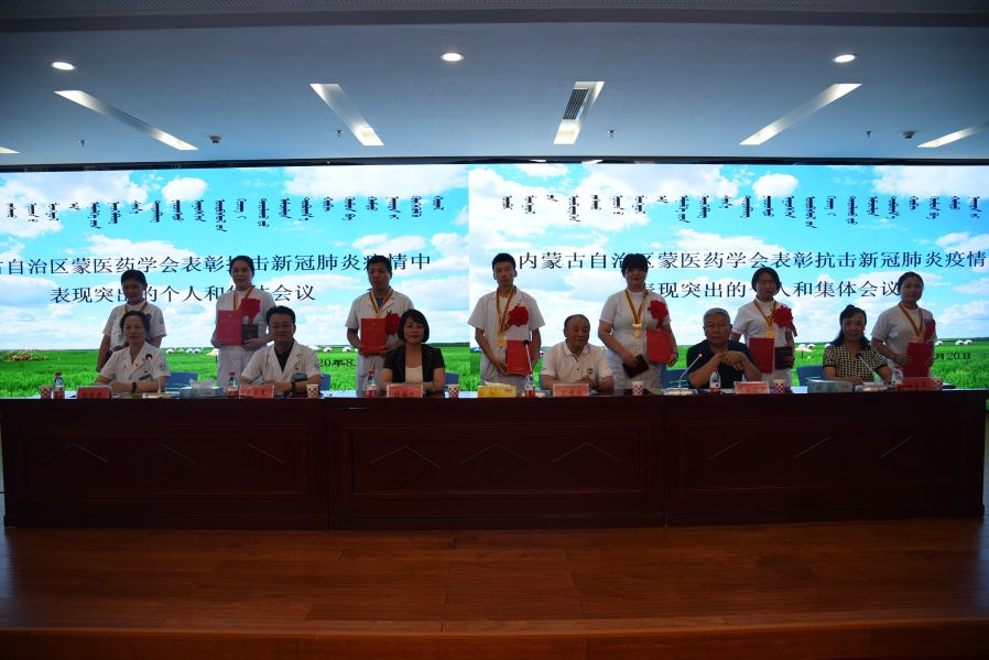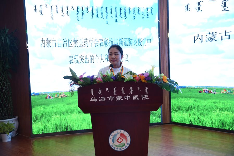 内蒙古自治区蒙医药学会办公室主任王文胜宣读了内蒙古自治区蒙医药学会《关于表彰在抗击新冠肺炎疫情中表现突出的个人和集体的决定》,乌海市蒙医中医医院被授予“抗击新冠肺炎疫情模范医院”称号,我院7名援助湖北医疗队队员被授予“抗击新冠肺炎疫情先进个人”称号。