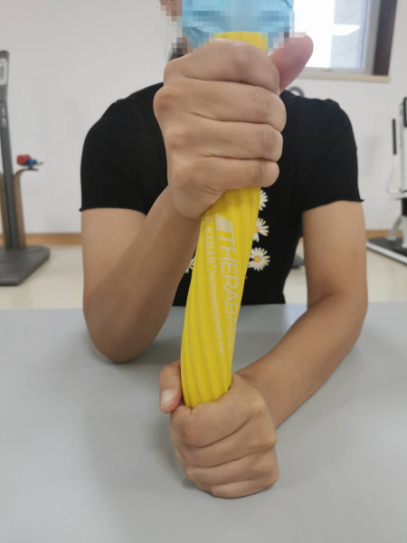 Thera-band扭力棒强调手腕屈肌和旋转器的偏心收缩,配合物理治疗对腕伸肌的强化,可以有效的减轻疼痛。