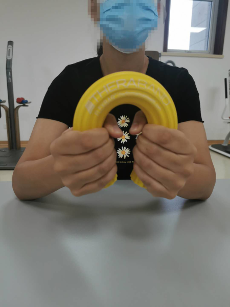 如图所示,患者在用Thera-band扭力棒进行康复锻炼: